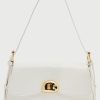 - The bag features a fixed shoulder strap and gold hardware.
