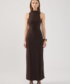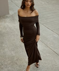 Women’s Dresses Perfect Stranger Rosetta Off Shoulder Long Sleeve Maxi Dress Ash Brown | Brown